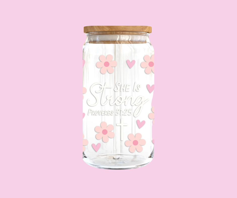 The She Is Strong glass cup holds 16oz of your favorite beverage, includes a bamboo lid and glass straw, this cute glass cup is the perfect way to enjoy your favorite beverage with style ✨️